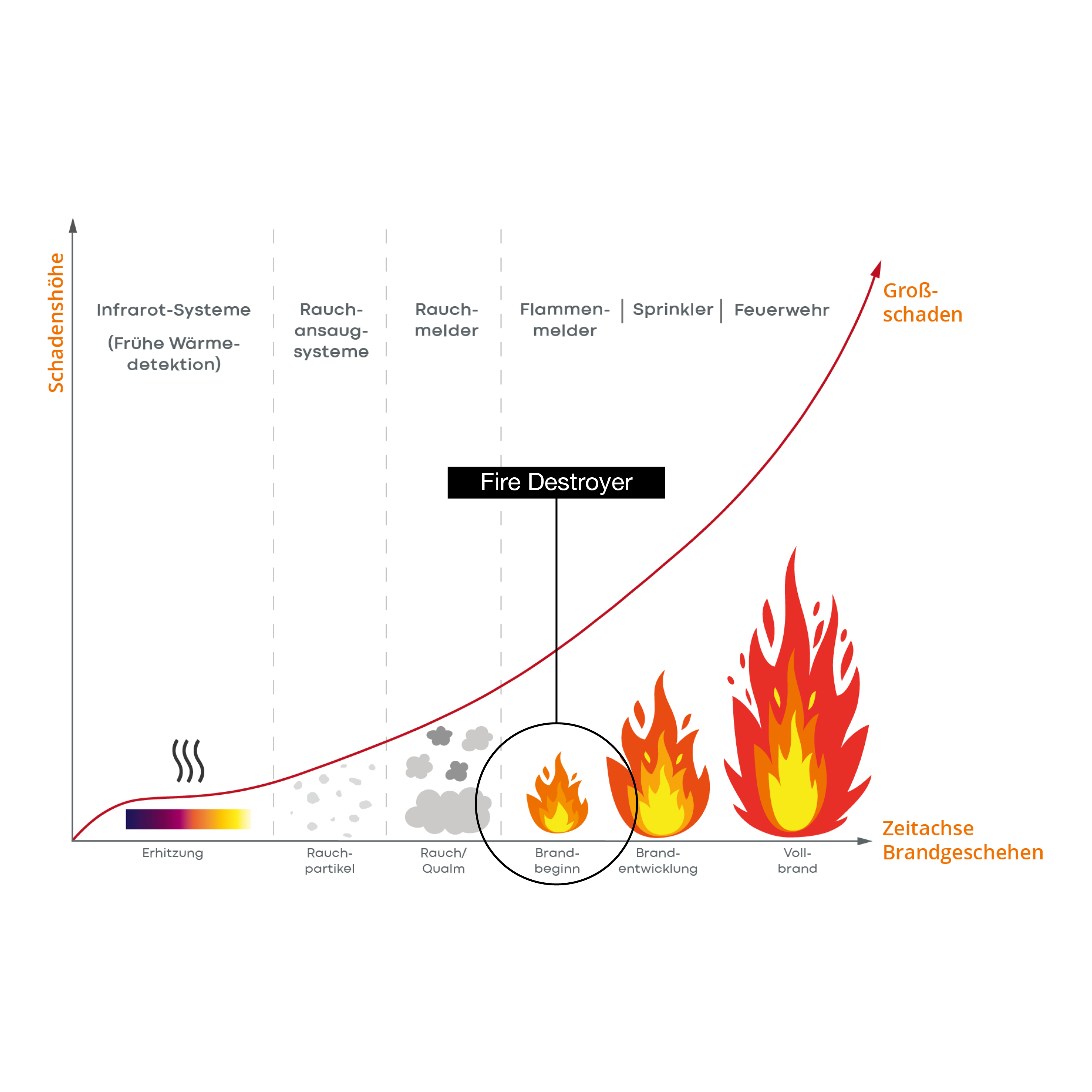 Fire Destroyer bietet effektiven Schutz für ungesicherte und brandgefährdete Bereiche, die oft Auslöser für Brände sind. Unser aktives Brandschutzprodukt lässt sich einfach als zusätzliche Komponente in bestehende Brandschutzkonzepte integrieren, sorgt so für mehr Sicherheit und kann dadurch die Schadenssumme eines Brandes erheblich senken.